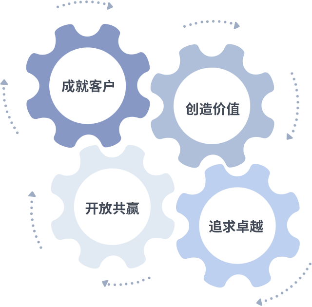 成就客户是一切决策的出发点,,,,创造价值是衡量所有工作的标准,,,追求卓越是我们做事做人的态度,,,开放共赢是我们的格局也是最终的结果。。。。价值观的齿轮环环相扣,,,推动着组织里的每个人不断向前。。。